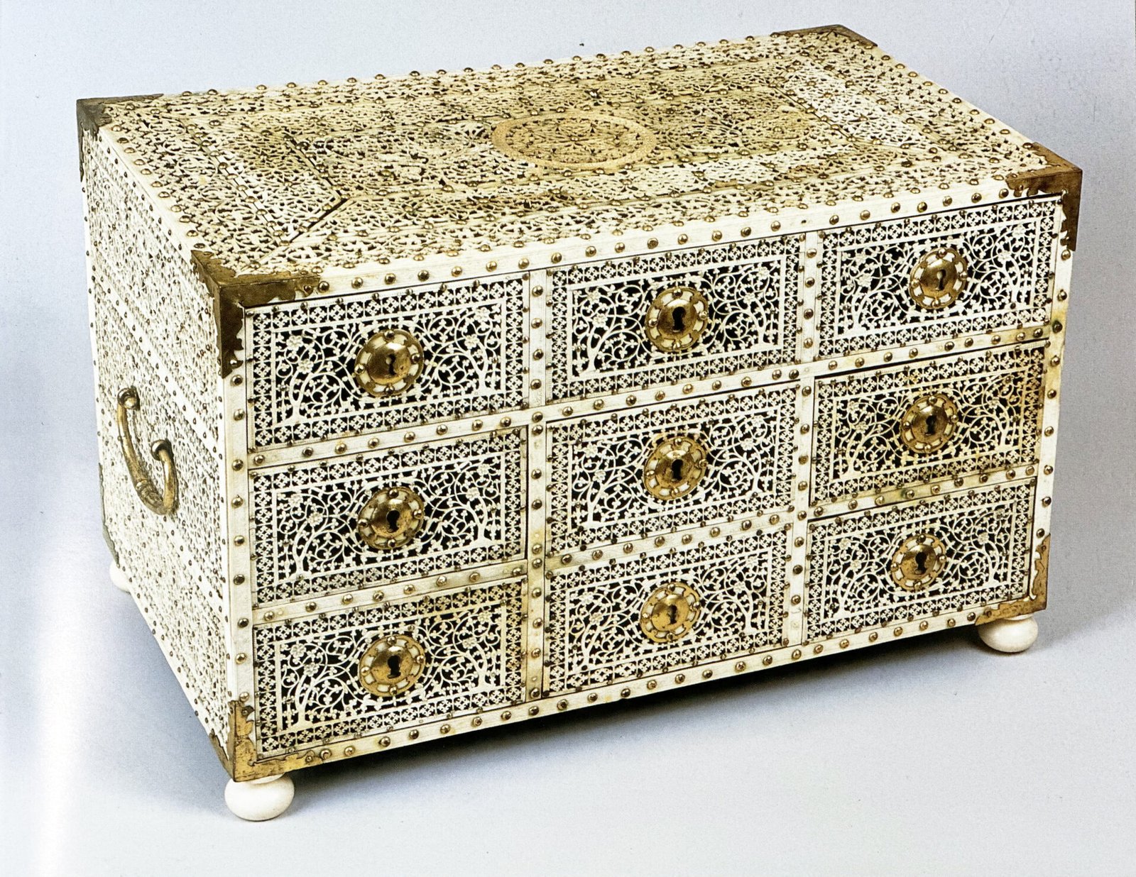 A decoração era realizada com embutidos em marfim, laca e metais com destaque para o bronze e mais raramente para a prata. Os motivos eram muitos diversificados – paisagens, cenas do quotidiano e de corte, caça, desenhos geométricos, e, mais raramente, brasões, monogramas e símbolos religiosos.