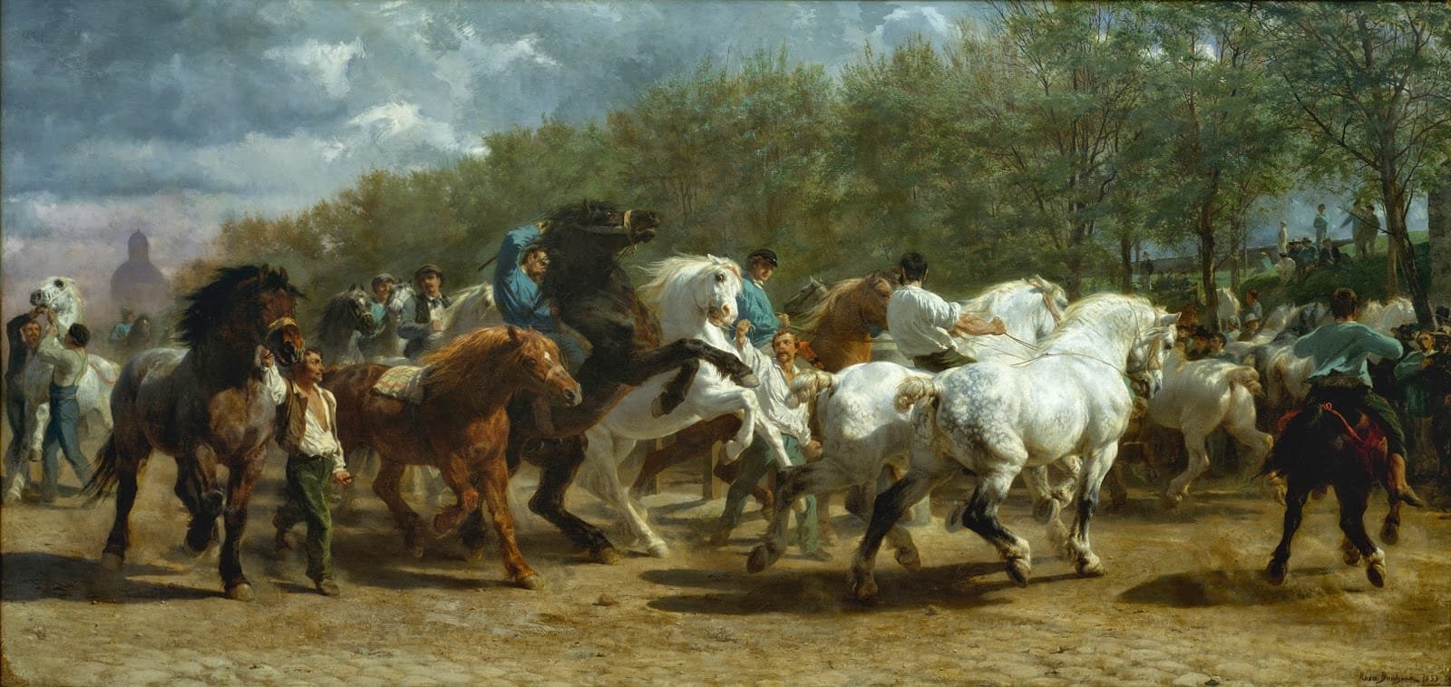 Mas, especialmente, Rosa Bonheur (1822-1899) um caso raríssimo de reconhecimento do talento feminino no século XIX, tendo inclusive sido admirada por Delacroix. Uma das suas obras mais emblemáticas é “A Feira de Cavalos”, não apenas pelo rigor e técnica exímia, mas pela forma como o tema é tratado pleno de vigor e movimento. A artista levou 18 meses a concluir o gigantesco quadro de 2,44 x 5,07 m, que hoje se encontra na Metropolitan Museum of Art em Nova York , e que mostra o mercado de cavalos de Paris. A obra foi descrita pelo New York Times como um “desfile enlouquecedor de carne humana e animal em uma cena de batalha épica”.