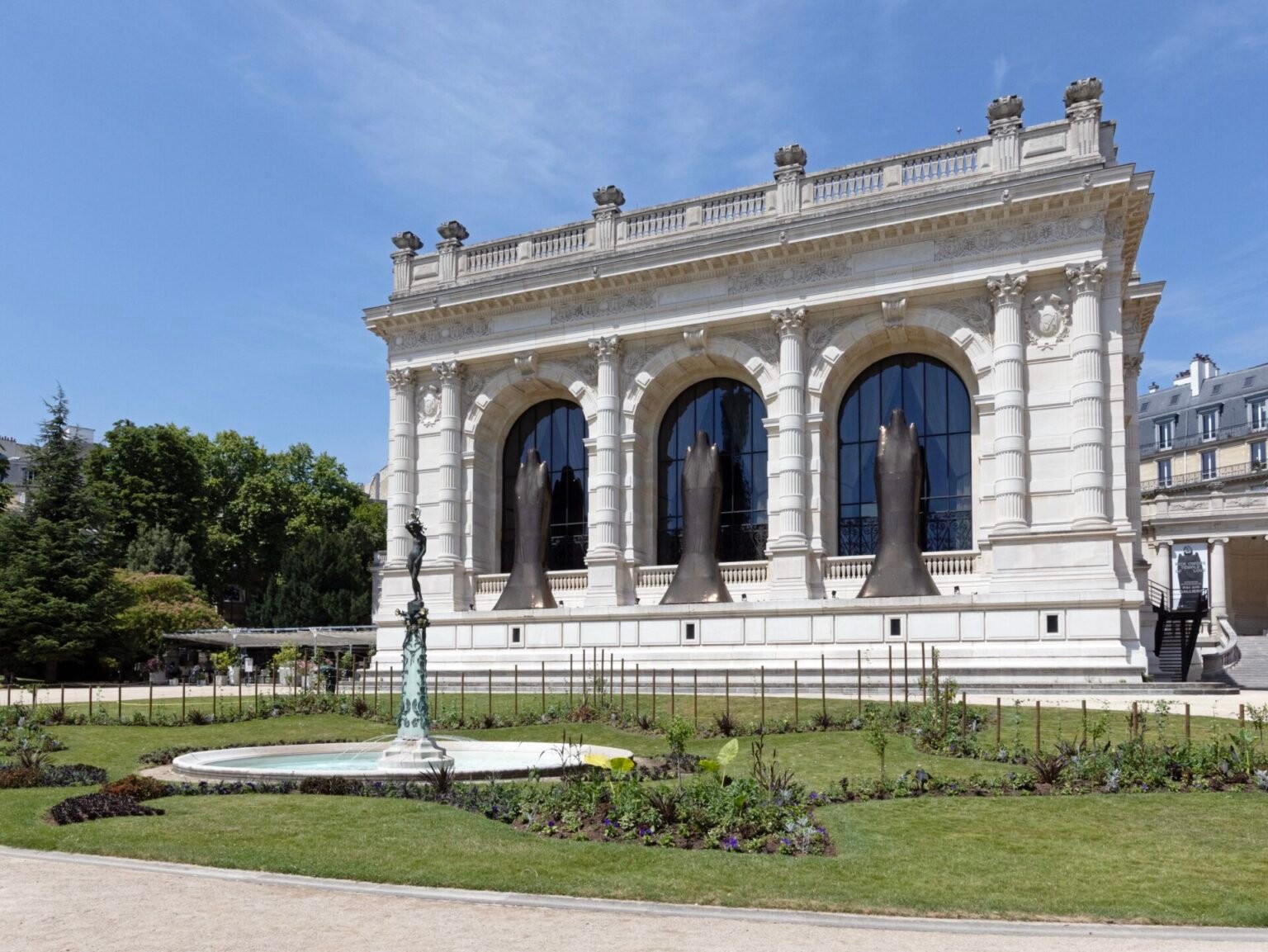 A obra de Rick Owens também se estende para o exterior do museu, onde ele envolveu as estátuas da fachada em um tecido bordado com lantejoulas. Instaladas no jardim do Palais Galliera, trinta esculturas de cimento com formas brutalistas, especialmente concebidas para a ocasião, remetem às suas criações de mobiliário. O canteiro de flores foi repensado com variedades que ele apreciava em Los Angeles.
