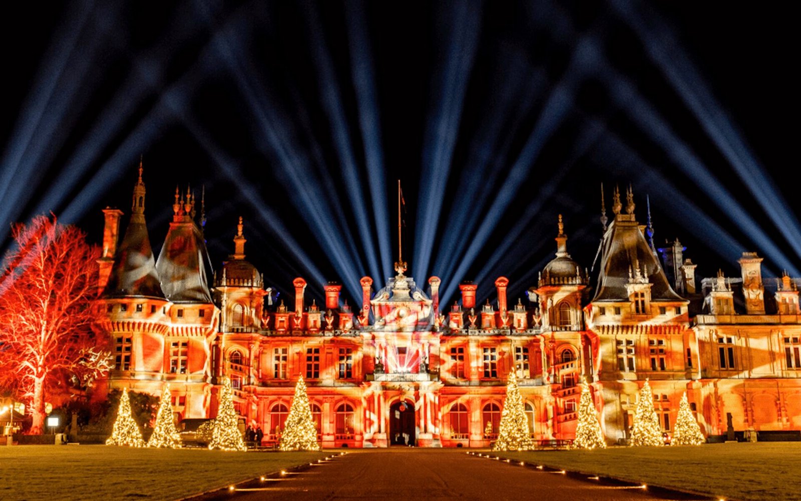 O Palácio Waddesdon com iluminações e decorações de Natal.